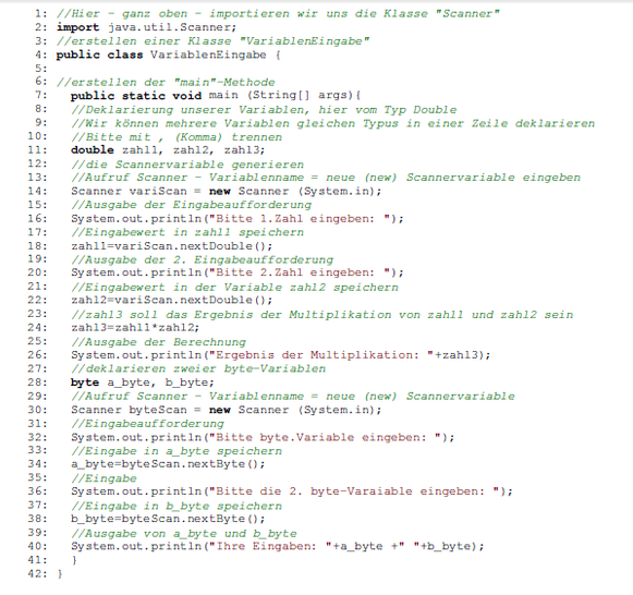 Mit der Klasse „Scanner“ sind wir nun in der Lage, unsere Variablen mittels Eingabe zu definieren. Durch Ausprobieren verschiedener Werte verstehen wir auch die entsprechenden Reaktionen unserer Programme. Wenden wir uns den verschiedenen Variablentypen zu. Kennengelernt haben wir die Variablentypen: